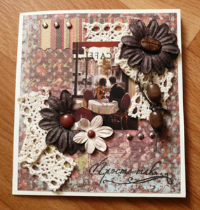 Бумага от K&Company кофейного цвета с красивыми потертостями. Зернышко кофе наклеила в сердцевинку цветка. На вощенный шнур надела деревяные бисинки, которые выполняют роль подвески. Остальные 2 цветочка держаться при помощи брадс. Т.к. тема кофе, то кружево намочила в растворе кофе (только для запаха, т.к. цвет уже был бежевым).